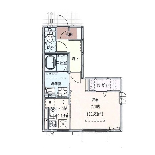 | 間取り内訳 | 洋室7.1帖、キッチン2.5帖、洗面脱衣室、トイレ、浴室1216サイズ |